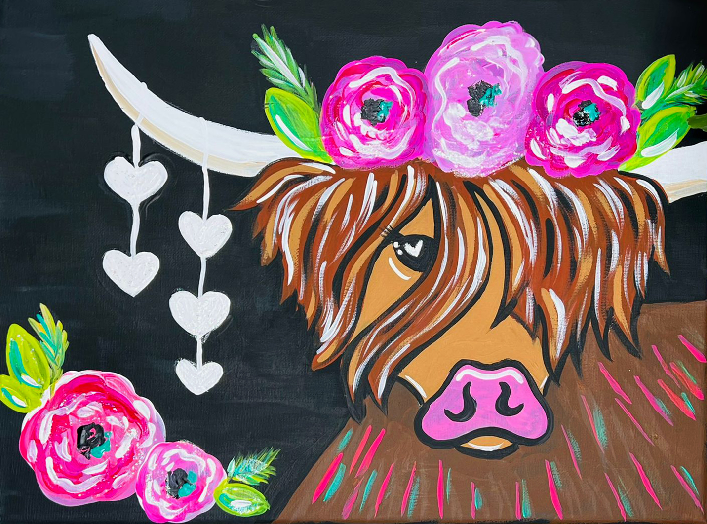 Celebrate the season of love with a little Scottish charm. In this guided acrylic painting workshop, you’ll create an adorable Valentine Highlander — a fluffy highland cow adorned with hearts and whimsical flowers. You’ll work on a pre-traced canvas, making it easy to jump right into the fun of painting without worrying about drawing.