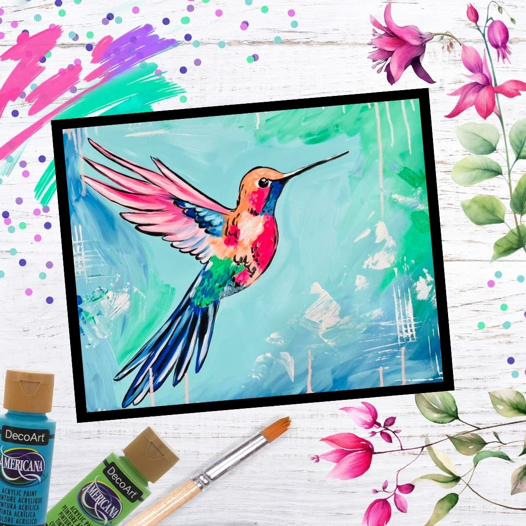 Celebrate the energy of spring with Hummingbird. In this guided acrylic painting workshop, you’ll create a lively hummingbird set against a bold, abstract colorful background. Using a pre-traced canvas, you can jump right into painting without worrying about drawing.
